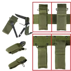 – Modèle massif lame 20/10 mm. Cran de sécurité, couteau, fourchette et cuillère détachables, ouvre-boîte affûté avec perce-boite, tire bouchon 5 spires, housse toile renforcée avec passant ceinture et crochet métallique pour ceinturon armée.